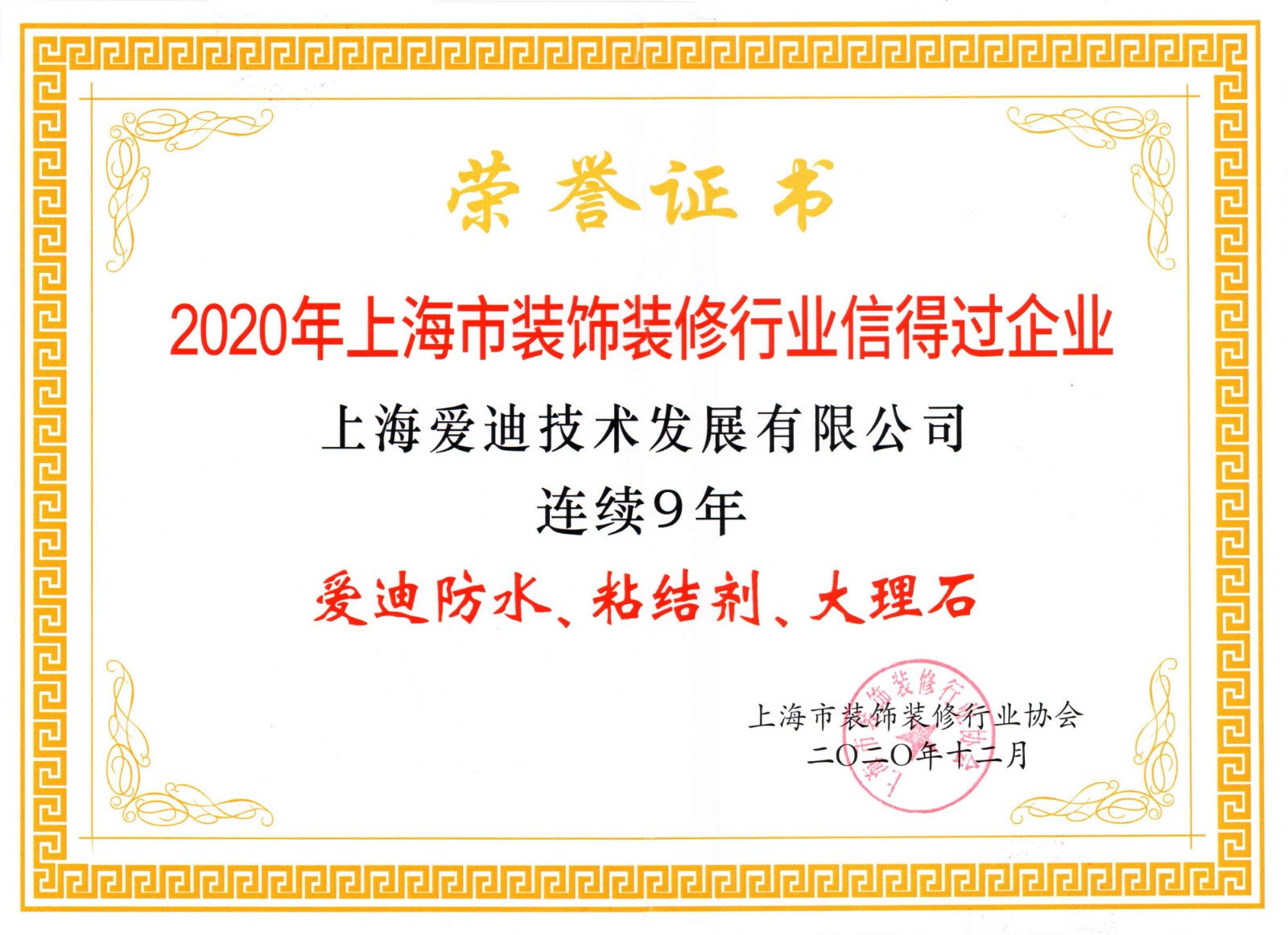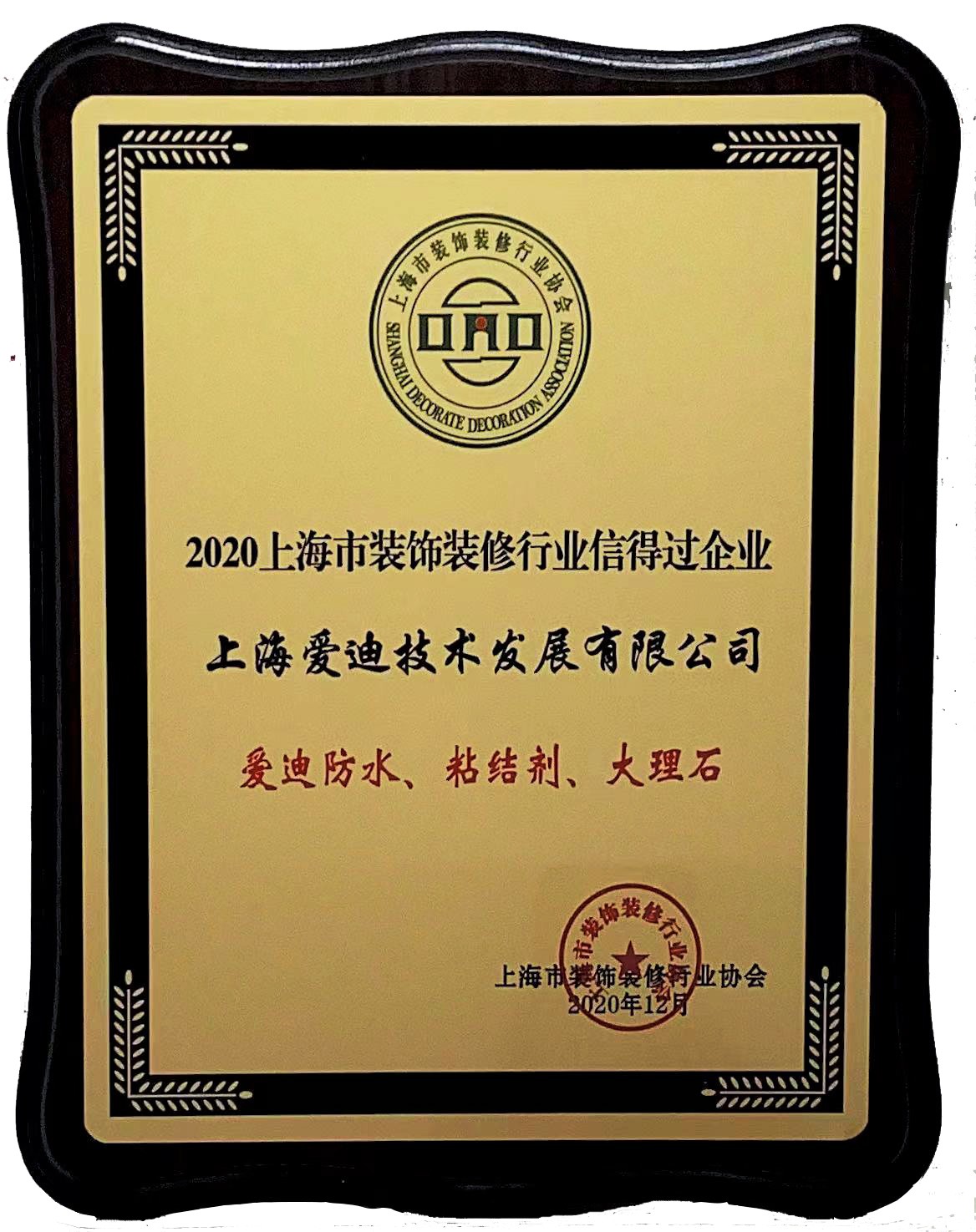 2020年上海市裝飾裝修行業信得過企業連續9年 愛迪防水、粘結劑、