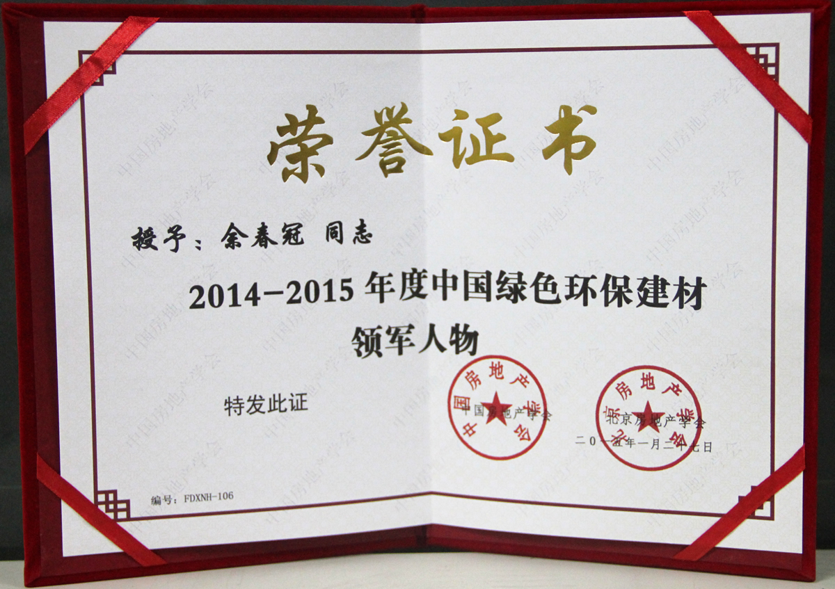 中國綠色環(huán)保建材領(lǐng)軍人物證書