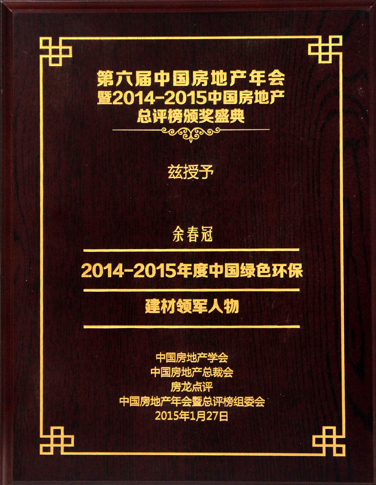 中國綠色環保建材領軍人物證書
