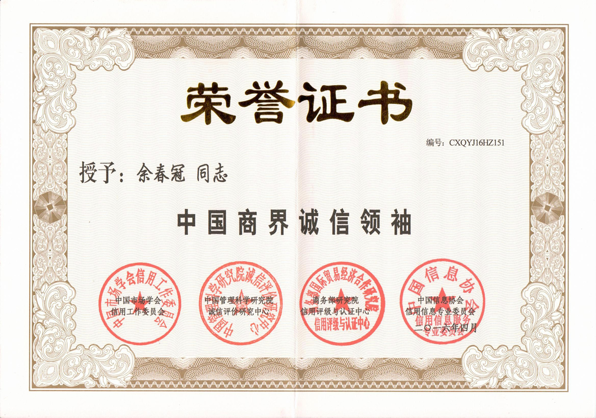 中國房地產學會—— 余春冠——中國商界誠信領袖 證書